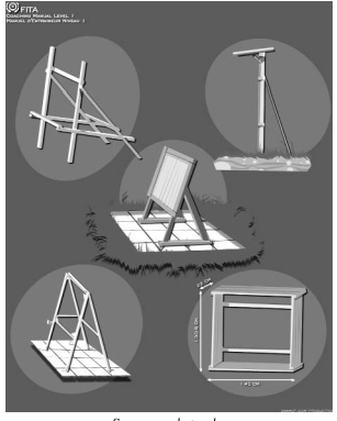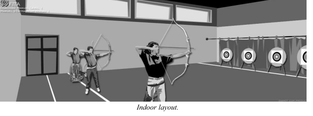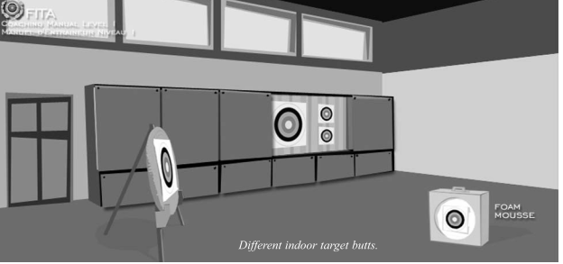 • Nếu bạn không có một bãi đất trống rộng rãi thì có thể tập trong nhà với cách bố trí bia ở phía trước, phía sau bia là khu vực đệm để giữ mũi tên nếu mũi tên bắn không trúng vào bia. Khu vực đệm có thể làm từ các vật liệu mềm như cao su, giấy bìa cactong, vỏ gỗ bào, mùn cưa, vải bạt…